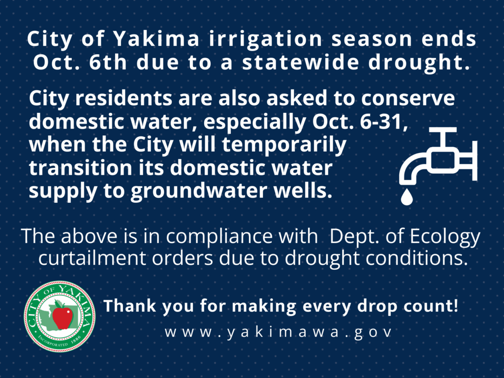 Monday, October 6th marks the end of the irrigation season for residential and business customers in the City of Yakima. That’s the day that the irrigation systems operated by the City of Yakima’s Water/Irrigation Division will be shut off until next spring. This is just over one week earlier than the previously scheduled shutdown of Wednesday, October 15th.