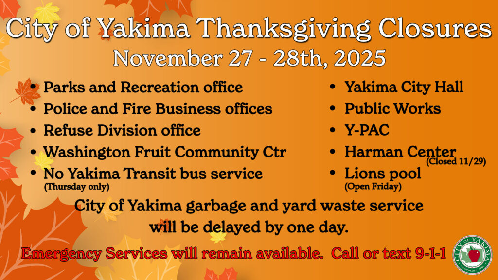 Many of the City of Yakima’s facilities will be closed Thursday and Friday, Nov. 27th and 28th, for the Thanksgiving holiday. That includes City Hall, Y-PAC, and Parks and Recreation offices.