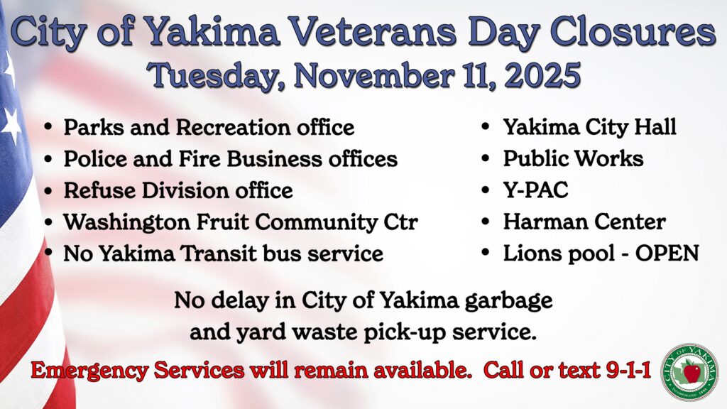 Many of the City of Yakima’s facilities will be closed Tuesday, November 11th, in observance of Veterans Day. That includes City Hall, Y-PAC, and Parks and Recreation offices.