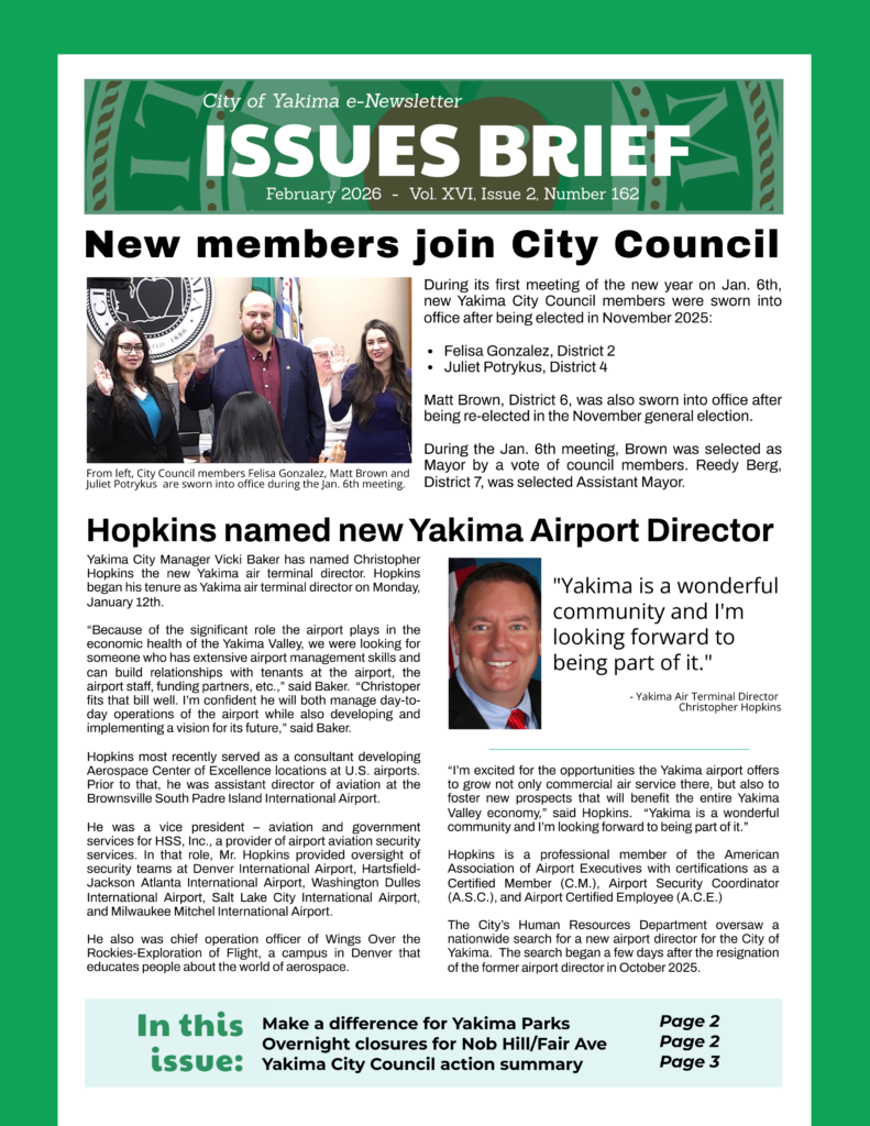 Feb 2026 Issues Brief Posted on February 2, 2026 (February 2, 2026) by John Fannin Click the following link for the February 2026 Issues Brief – Feb 2026 Issues BriefDownload Issues Brief is published monthly by the City of Yakima Community Relations Office.