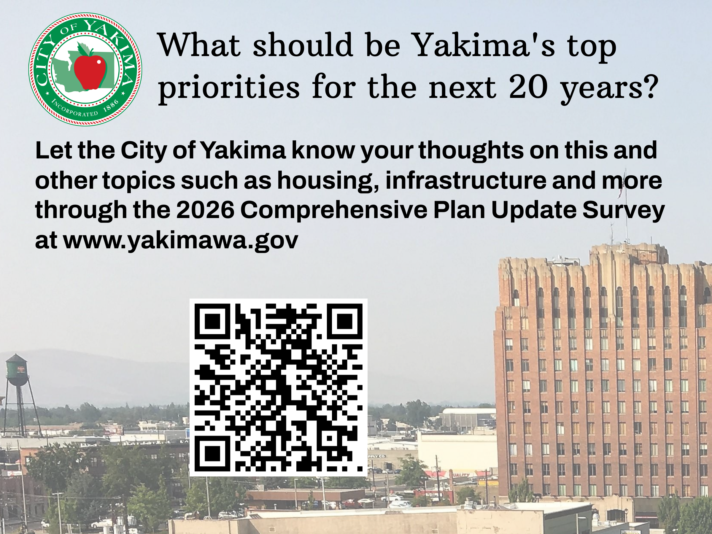 The City of Yakima is looking for YOUR input! We want to know what your vision for Yakima is for the next 20 years. To this end, the City Planning Division has created a survey to gain public feedback for its update of the Comprehensive Plan, which you can learn more about here.