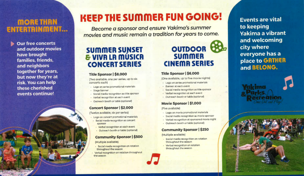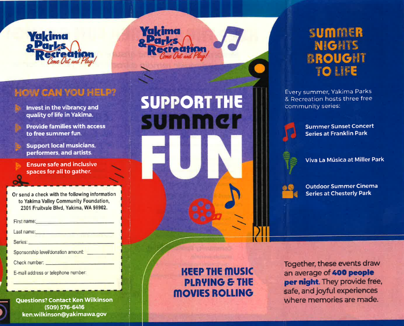 - YAKIMA PARKS & RECREATION COMMUNITY RECREATION FUND – Keep the Magic Alive in Yakima’s Parks! For generations, families across Yakima have gathered under the stars at Chesterley Park for movies, and filled Franklin and Miller Parks with music and laughter. Free summer events aren’t just entertainment—they’re where neighbors become friends, kids make memories, and our community comes together. Rising costs and budget cuts threaten these beloved traditions. These events make Yakima more vibrant, connected, and alive. They give our local artists a stage and our families a reason to gather. Every dollar you give keeps the music playing, the movies rolling, and our community thriving. Help us ensure every family in Yakima can enjoy these cherished summer traditions. Give today.