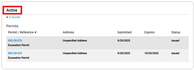 4. Navigate to the Active permits section and click on the permit number for the project you need to schedule an inspection for;